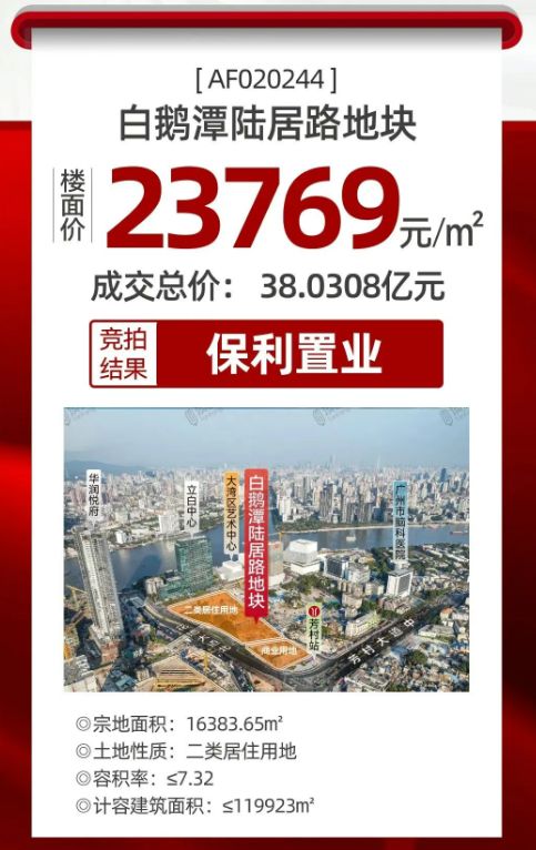 该地块由保利置业在岁除前一天以约38亿元总价竞得,楼面价不到2.4万/㎡,性价比极高。寓居地块愈加接近江边,前方仅有立白中心,而商业地块则更接近地铁芳村站,拟建造酒店,有音讯称或许是喜来登酒店。从地块方位来看,其具有极高的开发潜力与出资价值。