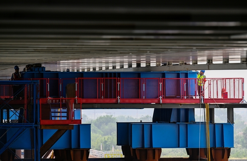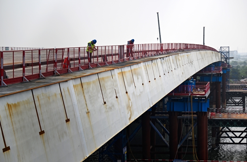 9月16日,施行工程人员在天津市滨海新区西中环快速路跨海河桥工程建造现场加固暂时护栏。