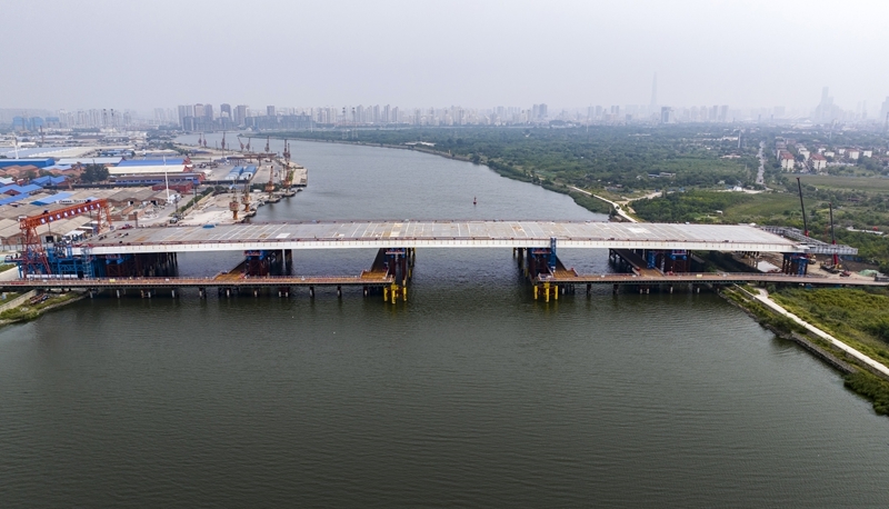 这是9月16日拍照的天津市滨海新区西中环快速路跨海河桥工程建造现场(无人机相片)。